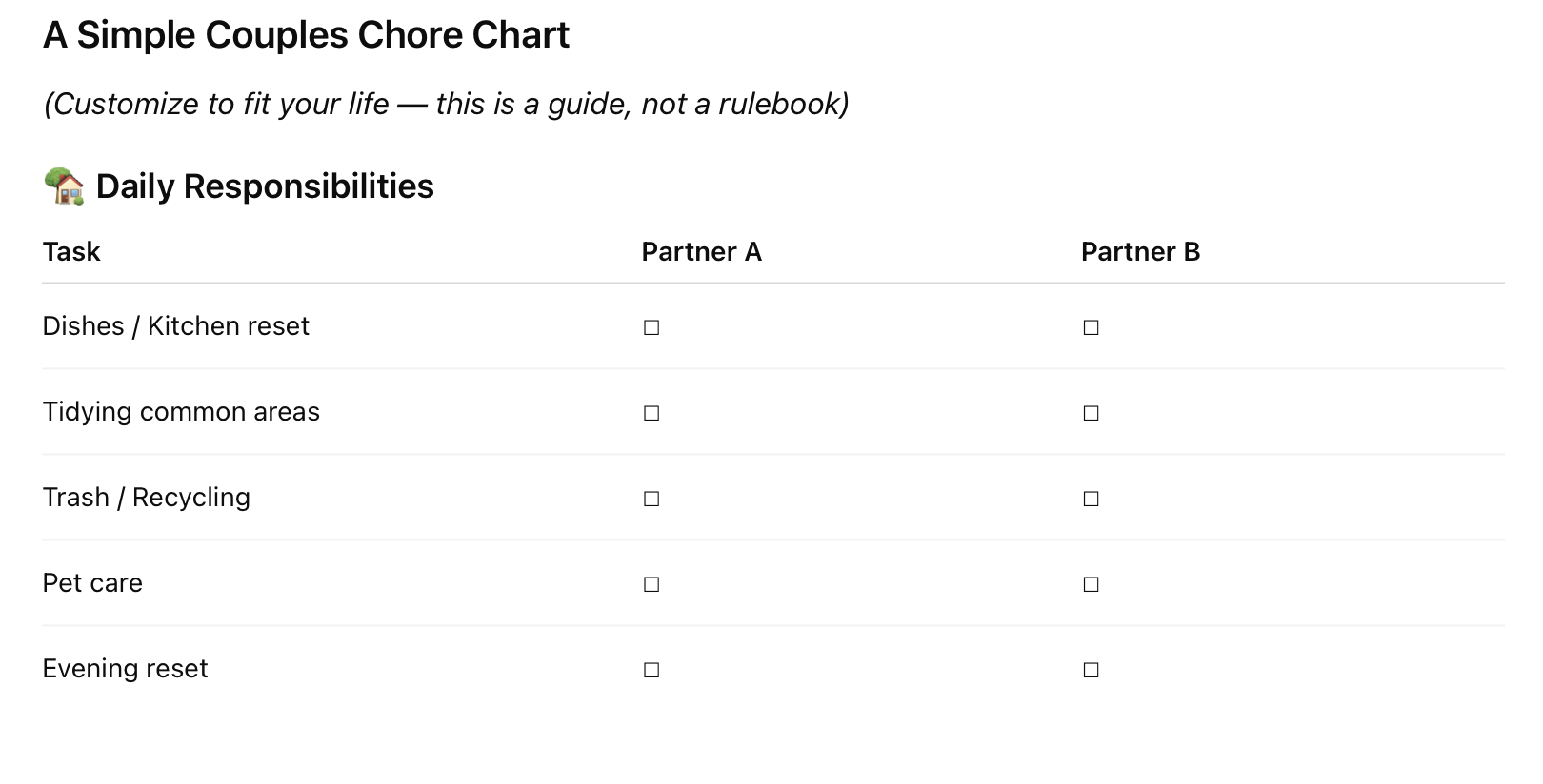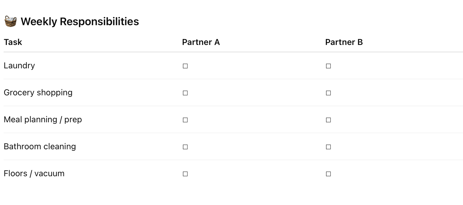 Create a weekly chore list for each partner and put it on the fridge -