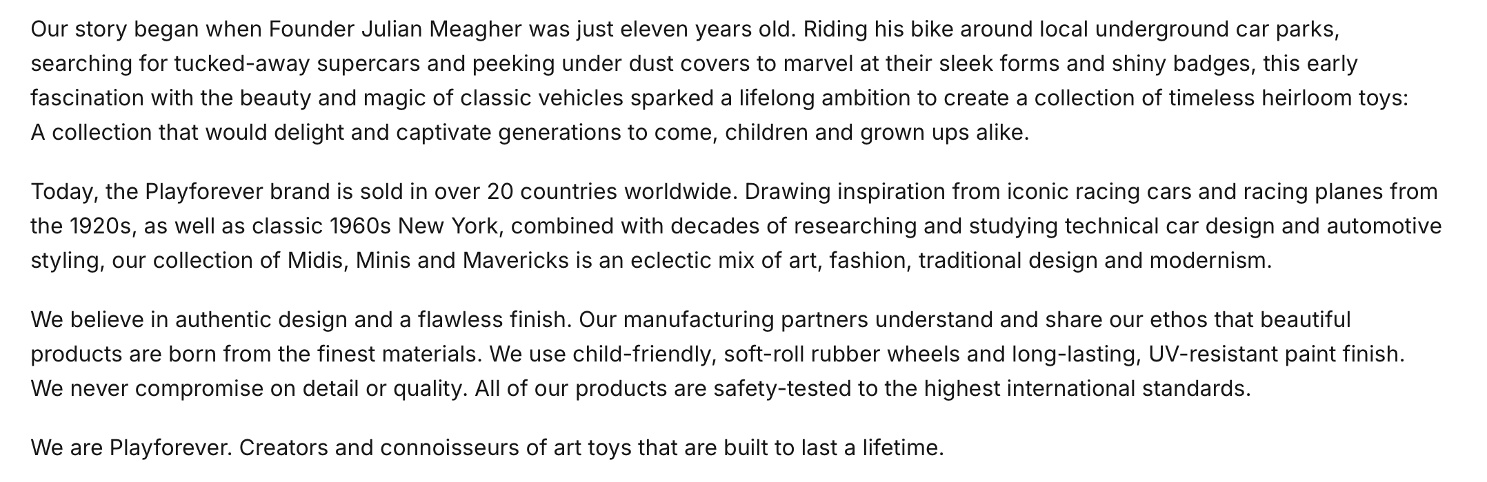 There’s something timeless about the joy of toy cars — the way a child drops to the floor, engine sounds humming from their imagination, creating whole worlds from a stretch of hardwood or sand. Toy cars invite independence, storytelling, adventure, and that beautiful focused play that feels almost meditative. Modern brands like Playforever elevate this simple joy with sleek, design-forward vehicles inspired by vintage race cars and mid-century aesthetics. Crafted to be both durable and artful, Playforever cars feel just as at home on a nursery shelf as they do zooming across the living room floor — blending imagination, craftsmanship, and style in the most delightful way.